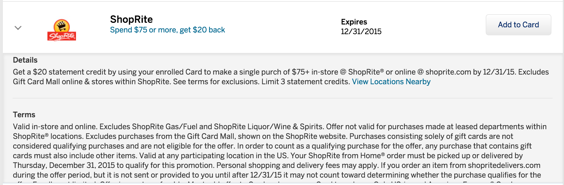 - Spend $75 or more at Shoprite with a registered Amex card and receive a $75 statement credit. Offer can be repeated 3 times!