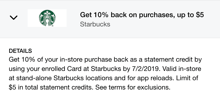 Get 10% or 15% of your purchase back as a statement credit by using your enrolled Card at Starbucks by 7/2/2019. Limit of $5 in total statement credits.Â