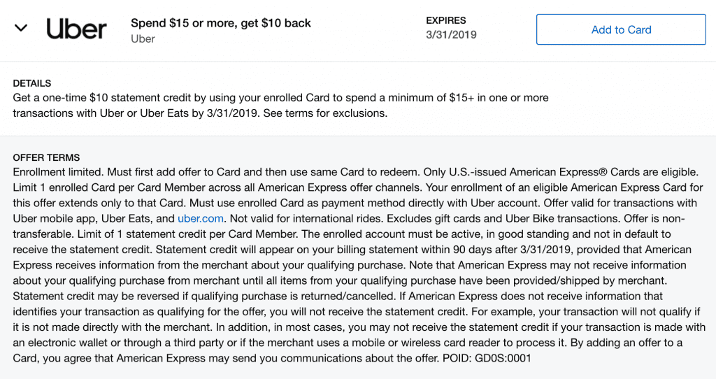 Get a $10 statement credit by using your enrolled Card to spend a minimum of $15+ in one or more transactions with Uber or Uber Eats by 3/31/2019.Â