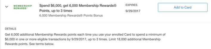 - Get 6,000 MR points when spending $6,000 in one or more transactions (1x extra points per dollar); deal can be repeated 3x for a total of 18,000 points