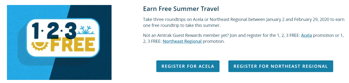 - Amtrak is offering a free roundtrip when you take three roundtrips on Acela or Northeast Regional between January 2nd and February 29th, 2020