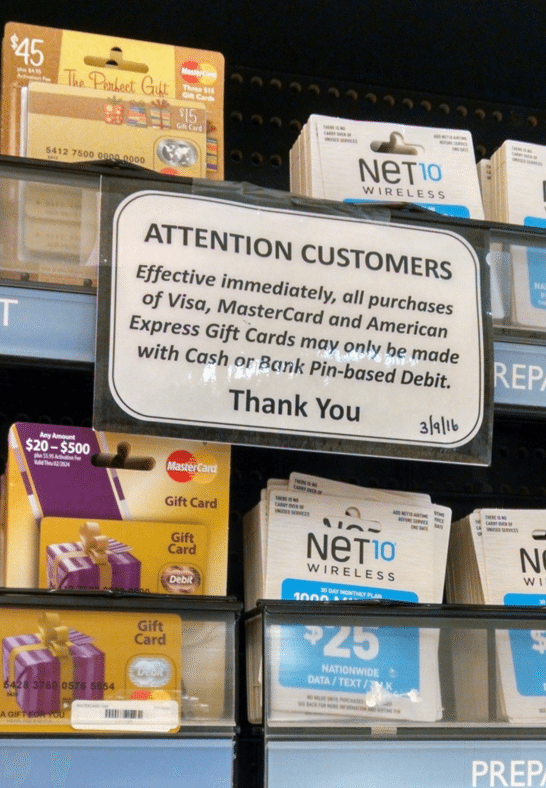 Sometimes there is a sign at the POS, sometimes a sign by the gift card rack, and sometimes it’s just a memo circulated internally.