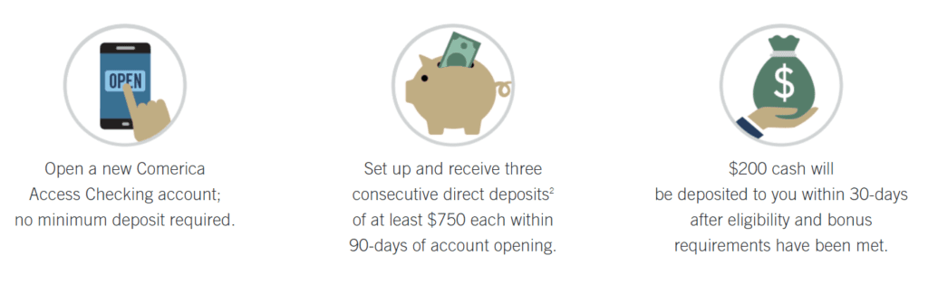 - Open a Comerica Access Checking account and complete these steps to earn the $200 offer. 1) Within 90 days of account opening, set up and receive three consecutive direct deposits of at least $500 or more to receive a $200 cash deposit to your new account within 30 days after eligibility and bonus requirements have been met.