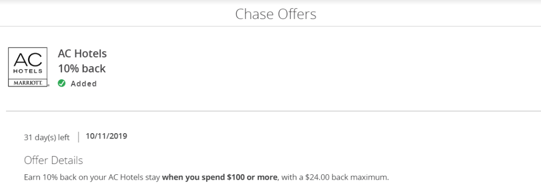 - Get 10% back on your hotel stays at AC Hotels . Minimum spend of $100 and maximum of $24 back. Valid until 10/11/2019