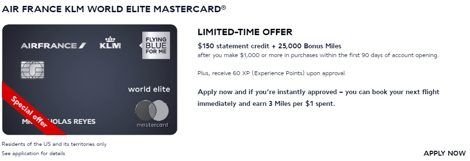 - Bank of America is offering a sign up bonus of 25,000 miles and a $150 statement credit after $1,000 in spend within the first 90 days after account opening on the AirFrance/KLM FlyingBlue Credit Card