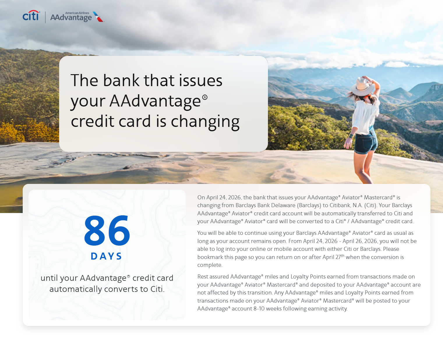 In December 2024 it was announced that Citi would become the sole issuer of American Airlines cards in 2026. Barclays stopped issuing new American Airline cards on 9/30/25.