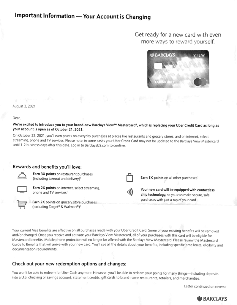 Barclays has sent out a letter to Uber cardholders stating that the card will be discontinued on October 22, 2021. Cardholders will be product changed to the Barclays View card that offers the following earning rate: