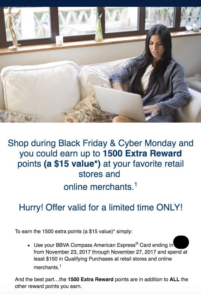 - To qualify for the 1500 extra points, you must have net Qualifying Purchases totaling $150 or more at retail stores and online merchants using your BBVA Compass American Express Card POST to your account between November 23, 2017 and November 27, 2017