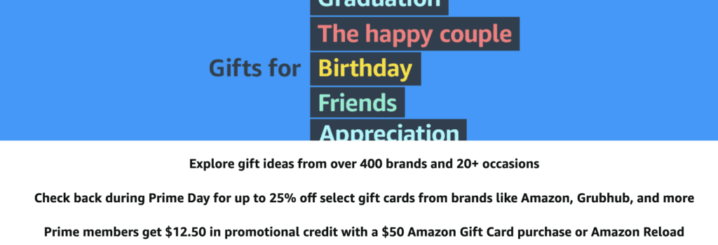 - Beginning on July 12am PDT, Prime members get $12.50 in promotional credit with a $50 Amazon Gift Card purchase or Amazon Reload when you use promo code EGCPRIME22.