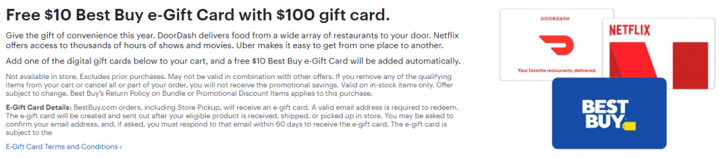 - Best Buy is offering a free $10 Best Buy gift card when you purchase a $100 Uber, Netflix or DoorDash gift card
