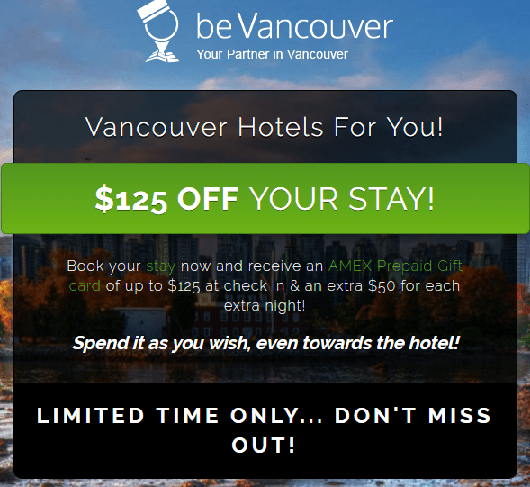 - beVancouver is currently offering an American Express gift card of up to $125 and an additional $50 per night on hotel bookings made for Vancouver.