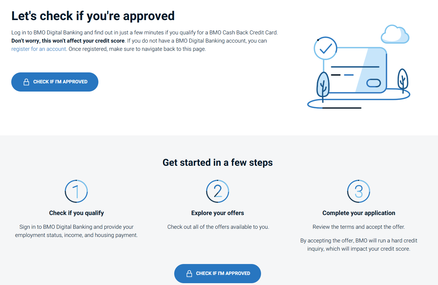 BMO has added a feature for users with an account that let’s them check if you are pre-approved for credit cards. You need to be logged into your account and provide employment status, income, and housing payment. No credit check is done until you accept your offer.
