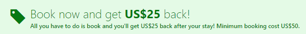 Honestly this deal isn’t that great, you need to complete a booking of $50+ and then you get $25 off a future stay. If it was $25 off $50 instantly then it would be a fantastic discount of up to 50%, but because a second booking is required the value drops.