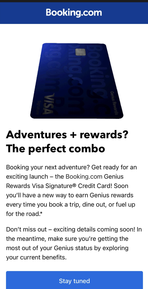 Booking.com sent out an email announcing an upcoming launch of their Genius Rewards Visa Signature credit card. The card will earn their Genius Rewards currency. No other detail are available on the card.