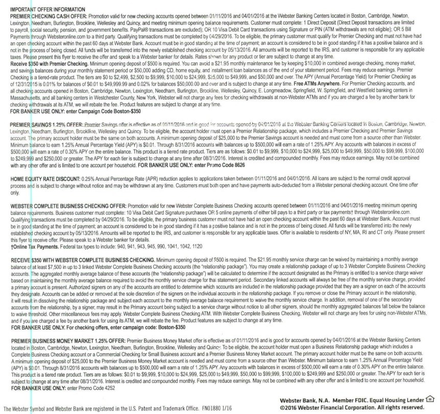- Webster Bank has taken over the Citi branches in Boston and to celebrate they are offering a $350 bonus on their premier checking account and complete the following requirement: