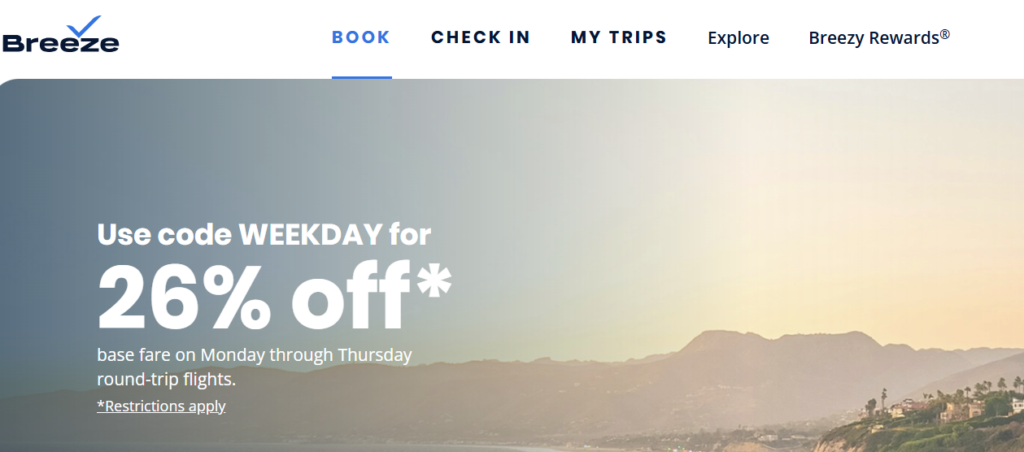 - Breeze Airways is offering 26% off when you use promo code WEEKDAY