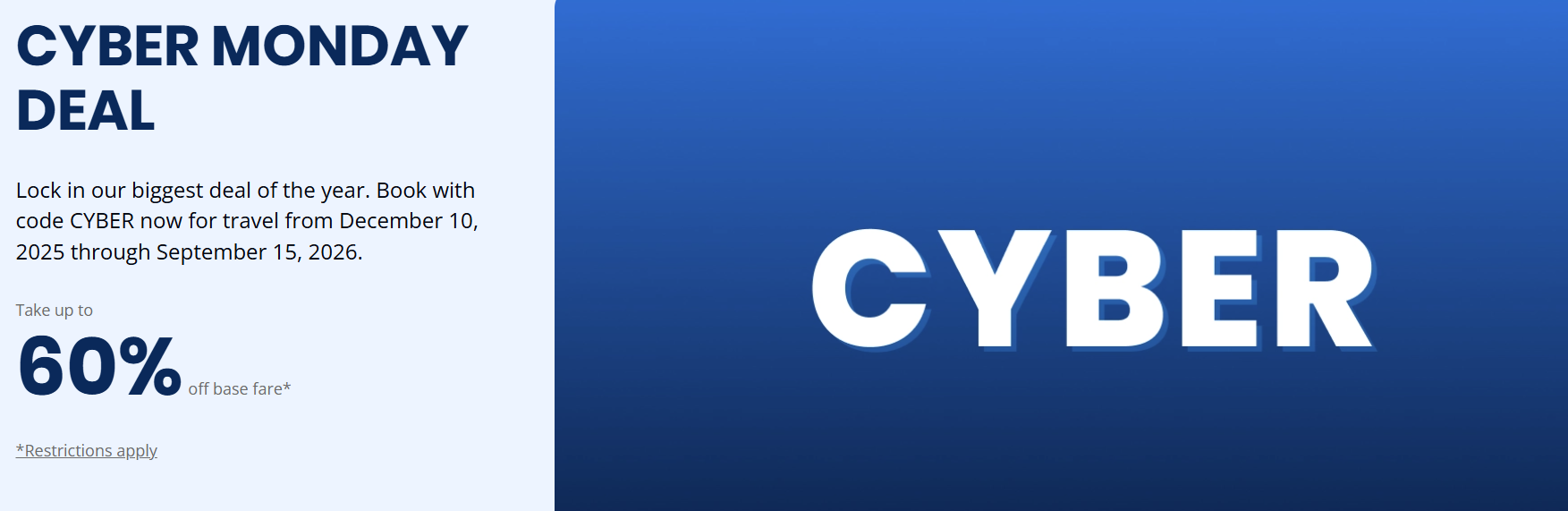 - Breeze Airways is offering up to 60% off when you use promo code CYBER