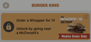- Get a Whopper Sandwich for just $.01 in the Burger Kind app when ordering within 600 feet of a McDonald’s.