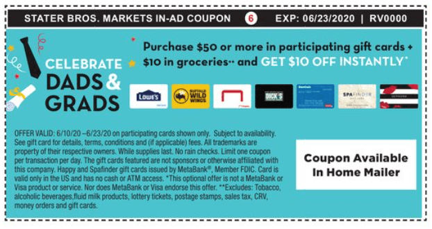 - Stater Bros is offering $10 off when you purchase $50 in selected gift cards and $10 in groceries. Eligible gift cards: