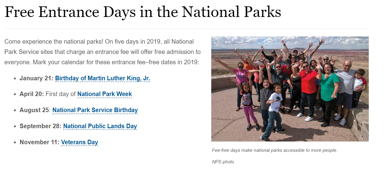 - Fee waiver includes entrance fees, commercial tour fees, and transportation entrance fees