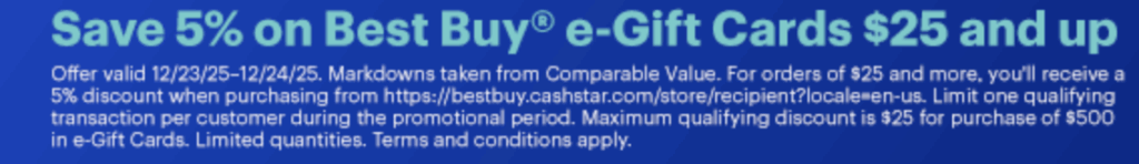 - For orders of $25 and more, you’ll receive a 5% discount when purchasing from https://bestbuy.cashstar.com/store/recipient?locale=en-us.