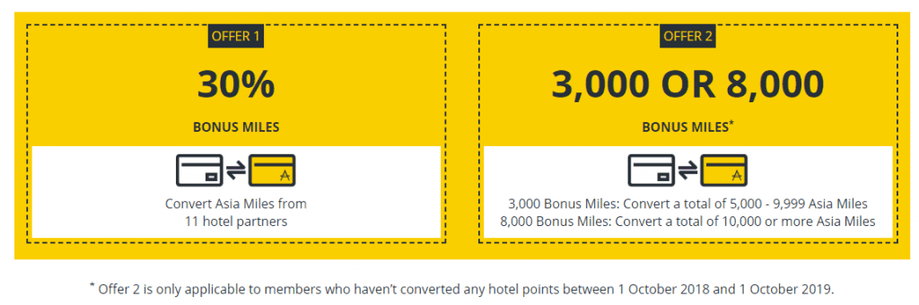 - If you haven’t converted any hotel points between 1 October 2018 and 1 October 2019 you can also get 3,000 bonus miles when you convert a total of 5,000-9,999 Asia miles or 8,000 bonus miles when you convert 10,000+ Asia miles