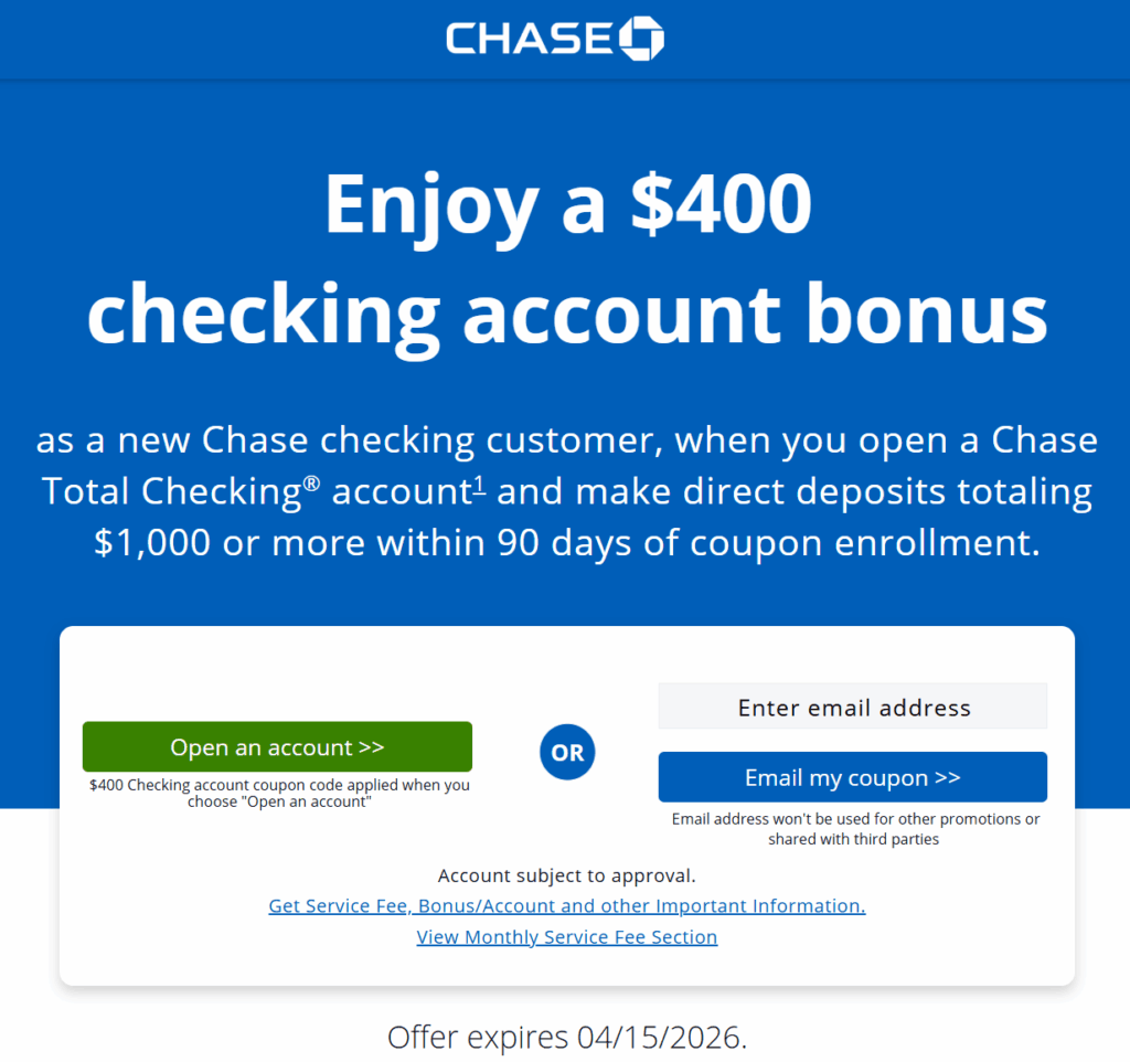 - Chase is offering a $400 bonus when you open a new total checking account and complete the following requirements: