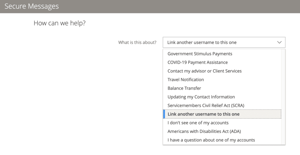 Go to: Secure Messages > New Message > Link another username to this one. And there you’ll get access to the form which can be used to combine two separate logins into one. It does take a couple of days for the login merger to complete.