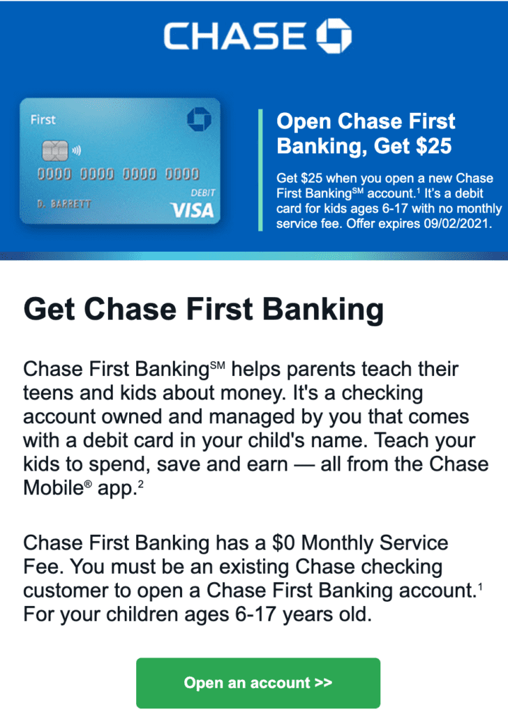 - Get $25 when you open a new Chase First Banking account. It’s a debit card for kids ages 6-17 with no monthly service fee.