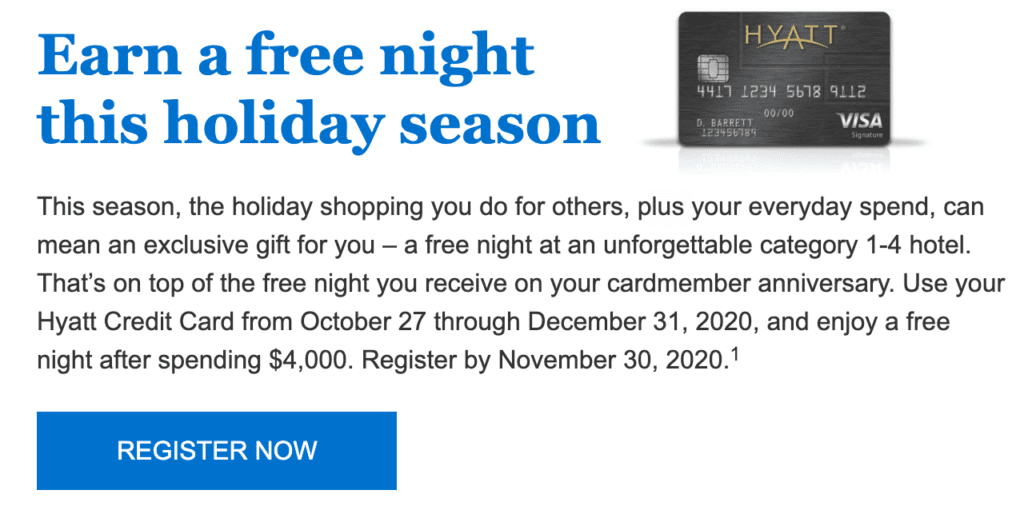 - Chase Hyatt cardholders can register to earn a free night at any category 1-4 hotel after spending $4,000 by December 31.