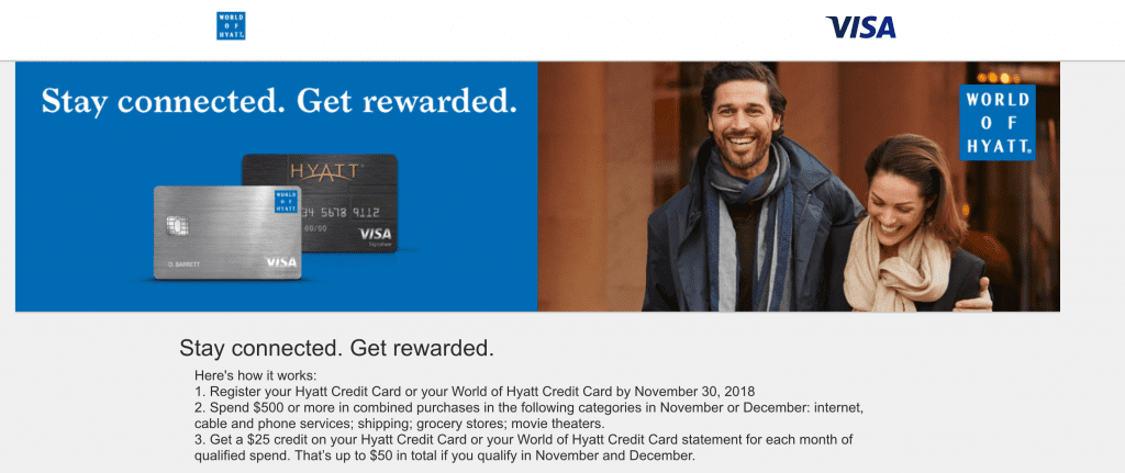 - Register to get a $25 statement credit when you spend $500 during the month November or December in the following categories: internet, cable and phone services; shipping; grocery stores; movie theaters.