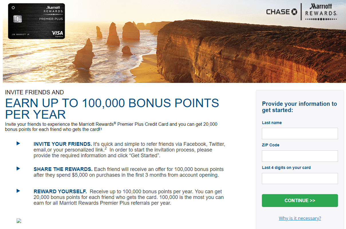 Chase is now letting cardholders refer new members to the 100,000 point offer. To generate referral links you need to use this link: https://www.chase.com/referafriend/marriottpremierplus?CID=PTNR. You’ll receive 20,000 Marriott points per approved card you refer, up to a maximum of 100,000 points. For more information on Chase referrals, read this post.