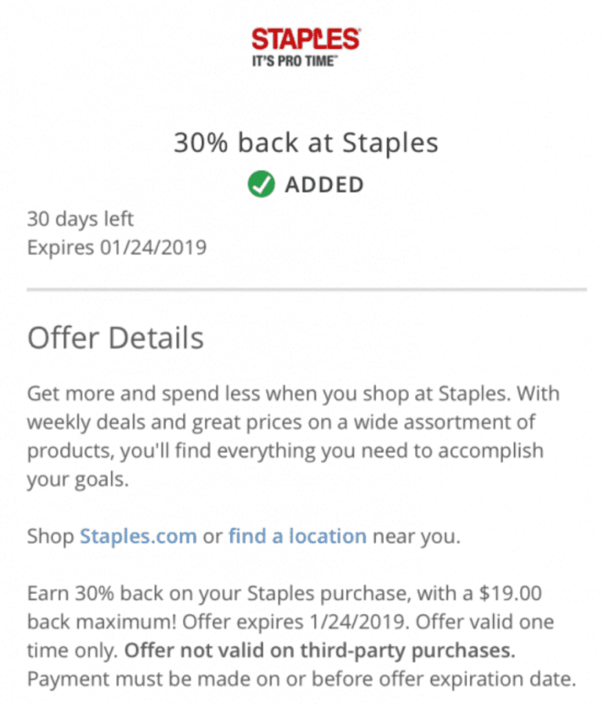 - Get 30% back at Staples or staples.com, max $19 cash back.