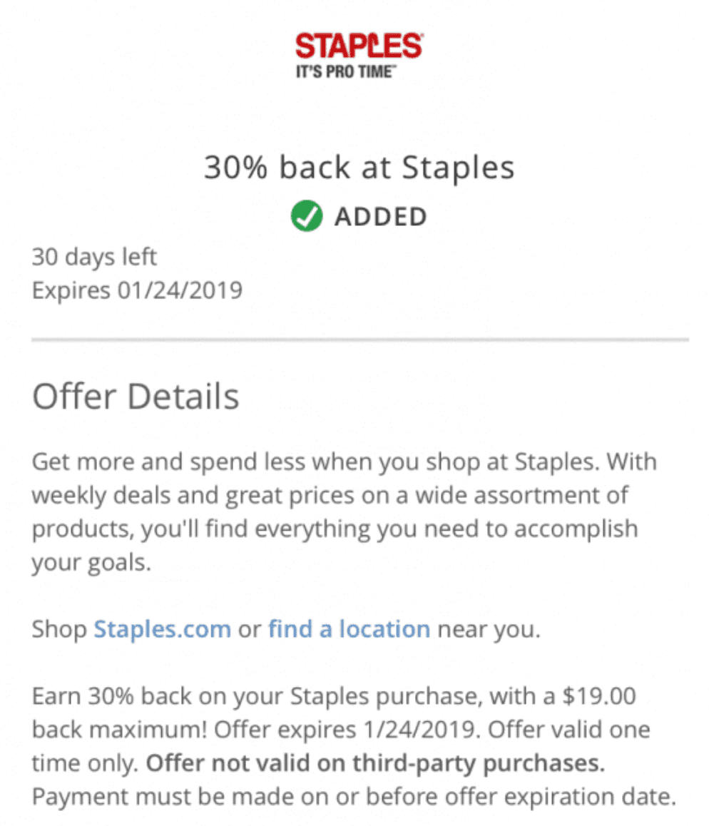 - Get 30% back at Staples or staples.com, max $19 cash back.