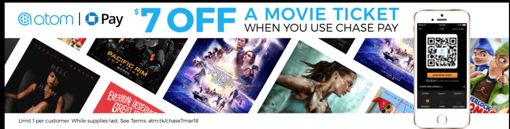 - Get $7 off any movie ticket on Atom Tickets when paying with Chase Pay