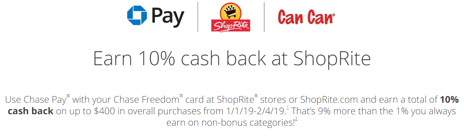 - If you use Chase Pay at Shoprite from January 1st until February 4th, 2019 you can get the following deals when using Chase branded cards:
