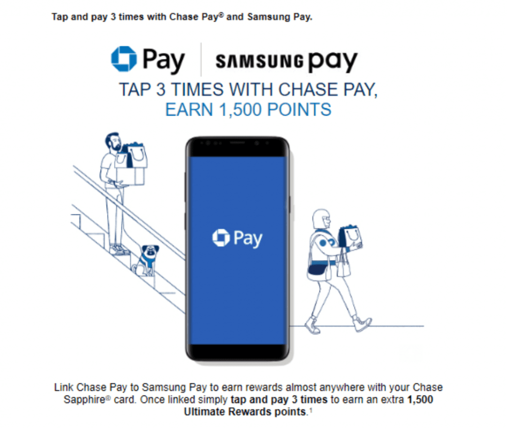- Tap and pay 3 times with Chase Pay linked to Samsung Pay and earn an extra 1,500 Ultimate Rewards points.