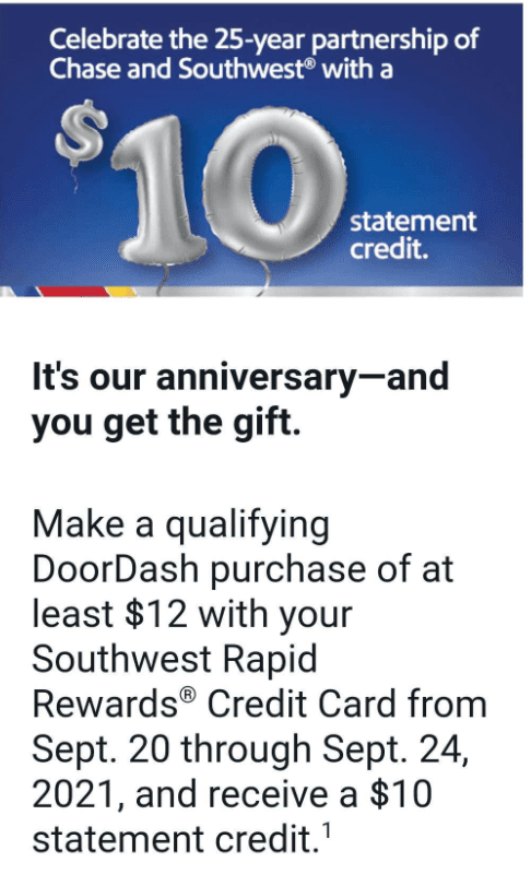 - Chase is offering a $10 statement credit to Southwest cardholders who spend $12 or more at DoorDash from September 20th through 24th.