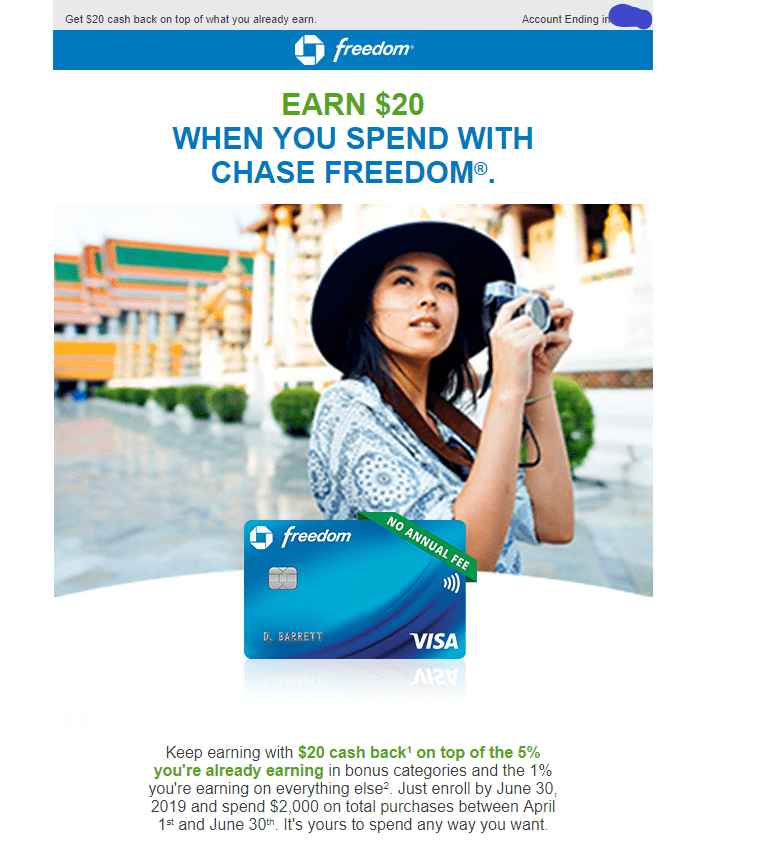 - Chase has sent out some targeted spending bonuses for Q2 2019 on some of their cards. Offers are through June 30, 2019 and require activation. Offers are as follows: