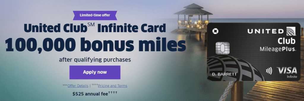 - Chase is offering on their United Club Infinite card 100,000 mile sign up bonus after you spend $5,000 on purchases within the first 3 months your account is open.