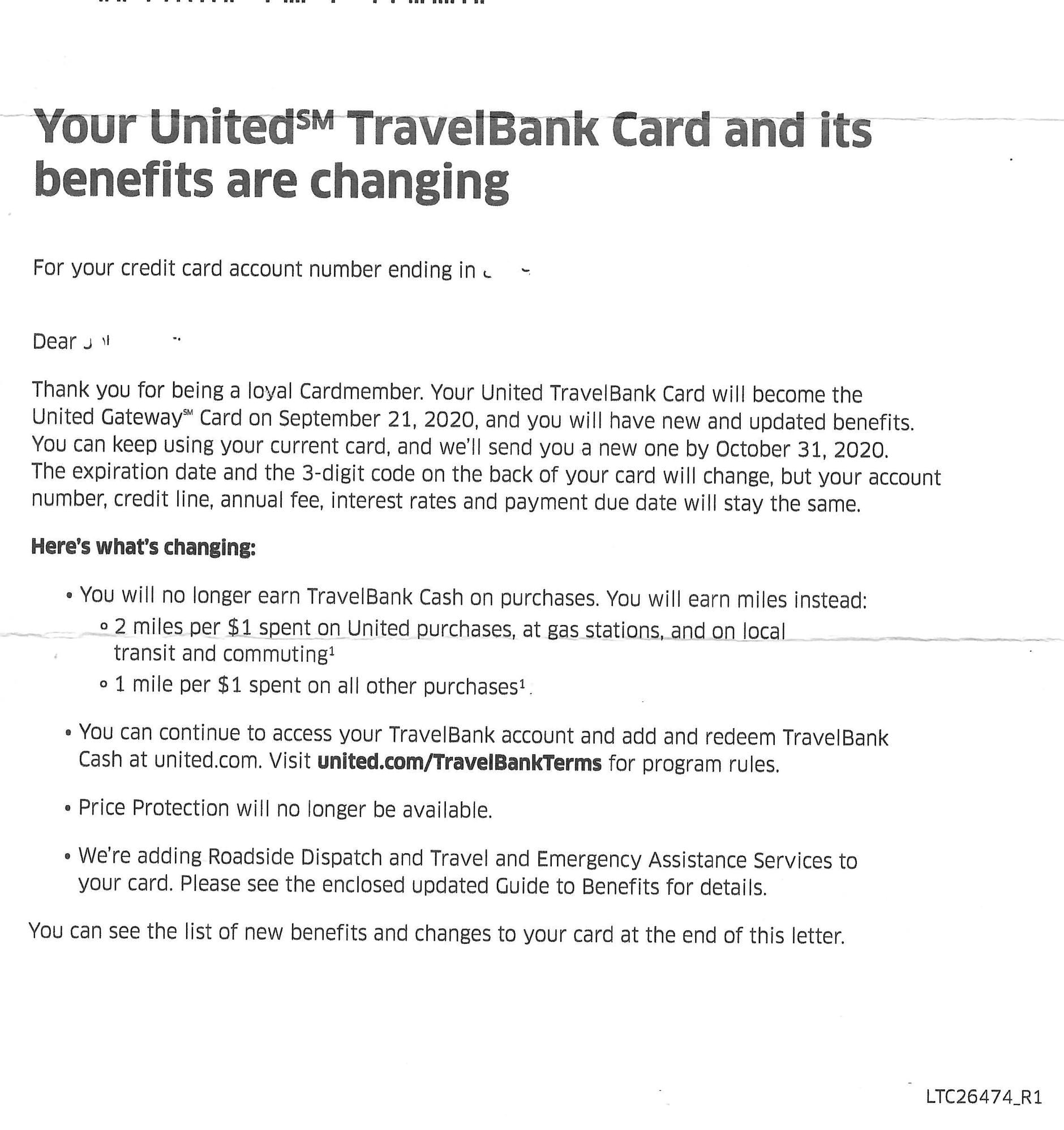 Chase United TravelBank cardholders have been sent a letter stating that their card will become the Chase United Gateway on September 21, 2020. The main differences are as follows: