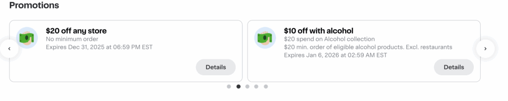 - $20 off any restaurant (powered by UberEATS) with $30 minimum purchase, expires 12/5/25. There were two of these.
