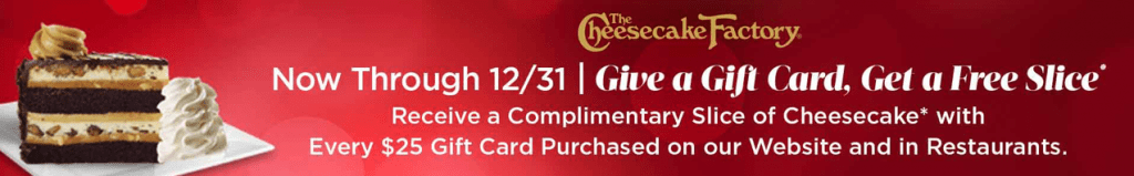 - The Cheesecake Factory is offering a free slice of cheesecake for every $25 gift card purchased on their website or in restaurant.