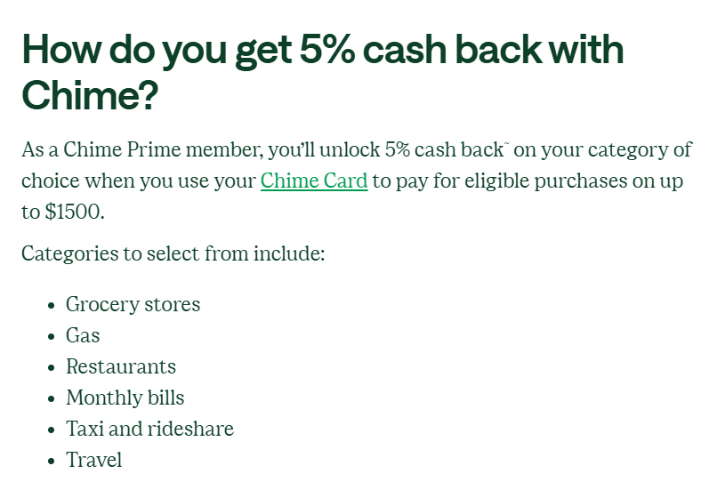 One of the benefits of Chime Prime is access to 5% categories on the Chime card. Categories to choose from include: