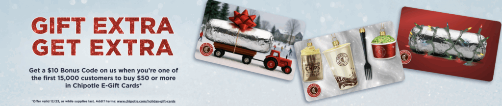 - Chipotle is offering a bonus $10 e-gift card when you buy a $50 e-gift card.