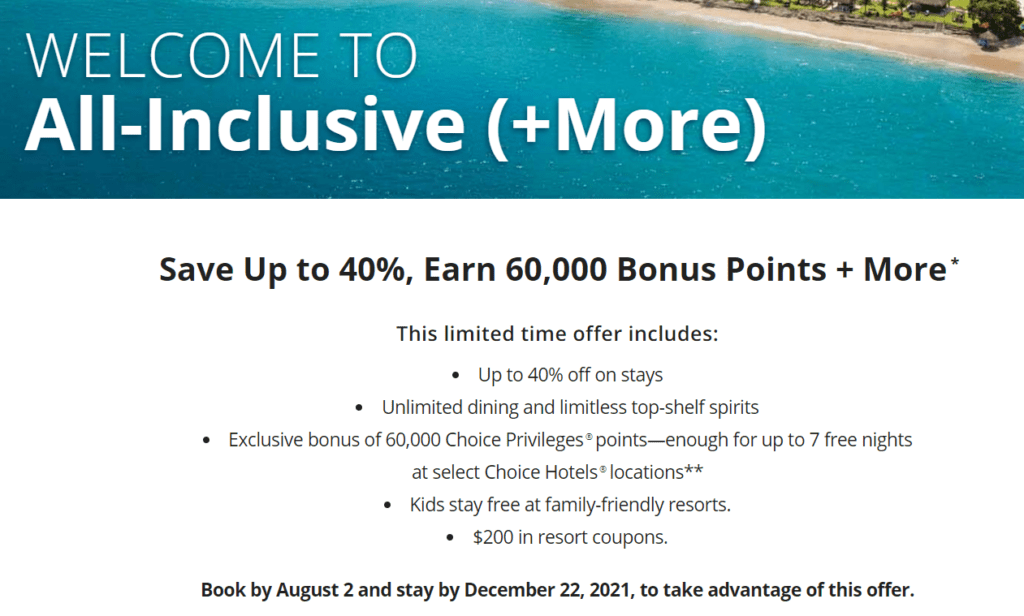 - Choice is offering 40% off and 60,000 bonus points when you stay at any AMResort by December 22, 2021. Must book by August 2nd. Other benefits include: