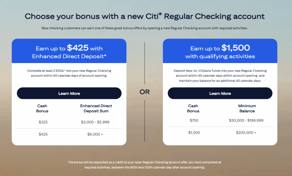 /$425checking bonus- Open a new eligible Citi® Checking account with Enhanced Direct Deposits, and enroll in this offer by applying directly from this page.