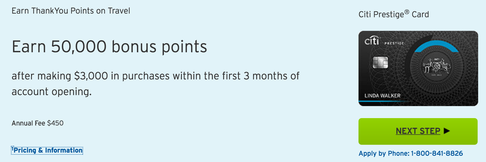 - The current Prestige offer is to get 50,000 ThankYou points after spending $3,000 within three months. $450 annual fee, NOT waived the first year. You do get a $250 airline credit each calendar year.