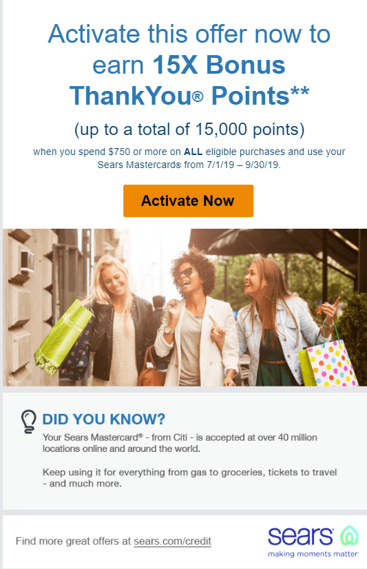 - Earn 15x ThankYou points per $1 spent when you spend $750 or more on all purchases between July 1st and September 30th, 2019 (maximum of 15,000 points). Some people have this same deal but only on specific categories.