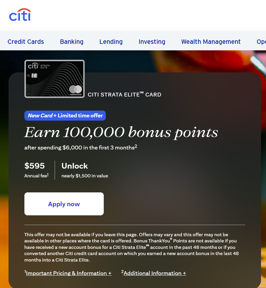 - Citi Strata Elite is offering 100,000 points after $6,000 in spend